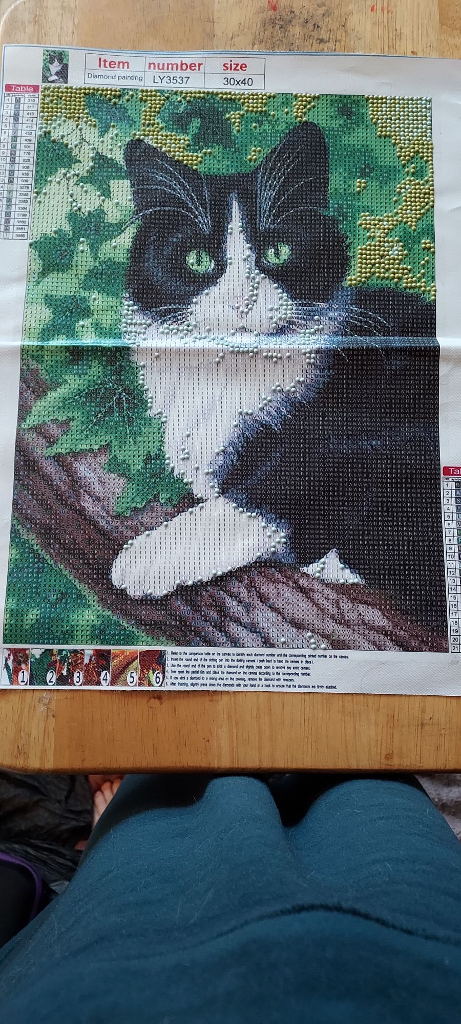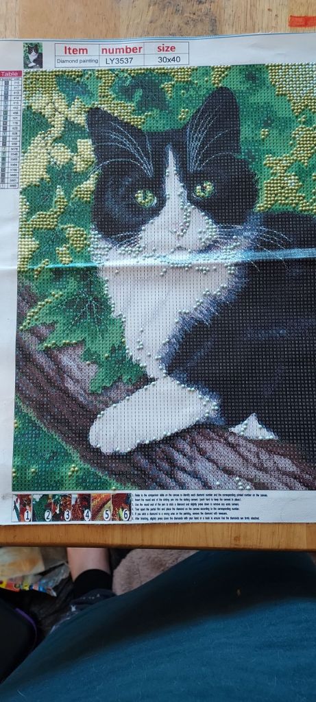 After being done with emotionally exploding on paper I decided to do some artwork. The type of artwork I decided to do was diamond art/painting. It is the same diamond art/painting that I have been working on for the last few days which is the tuxedo cat in a tree. Doing diamond art/painting is a long process that teaches patience to people who don’t have any and is very enjoyable to do. I really love doing diamond art/painting because it is fun and is teaching me patience.