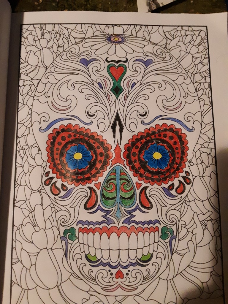 Besides watching late night television, I have been doing art work. Specifically, I have been coloring. I recently received a Day of the Dead coloring book from a friend. I am including a picture of what I colored as I started coloring it tonight and this is how far I have gotten. It is obviously not finished if you are not sight impaired. I love coloring and it helps me relax. Coloring is a type of meditation for me. For those who are sight impaired the picture of what I colored so far is below and I have included a caption with it.
