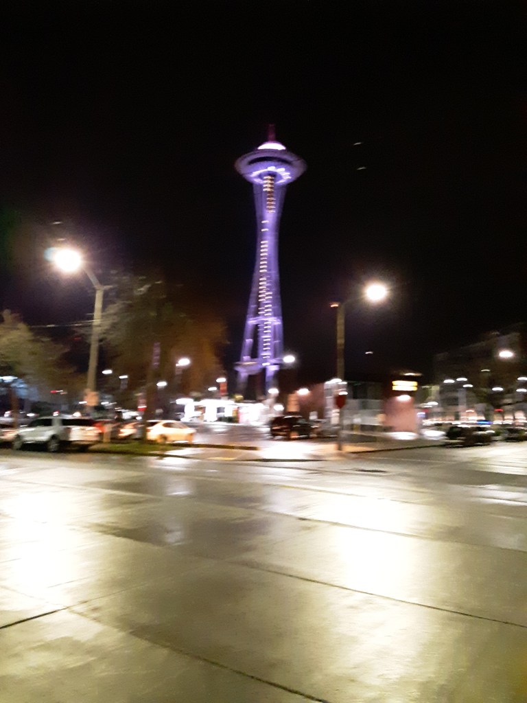 Good Morning, World!!! Today’s topic for the photography course I am taking is “Street.” So, I decided to use picture I took during the holidays. I took a picture of the Seattle Space Needle lit up in Purple as purple is my favorite color. As you can tell I took a picture from across the street from the Space Needle and surprisingly no cars are driving by. As you can tell the street is wet from rain. The Space Needle is down the street from where I work and I remember taking the picture below as I was going to work. I also remember that I took the picture the week in between Christmas and New Years. For those who are sight impaired I put captions in with the photo explaining what the picture is.